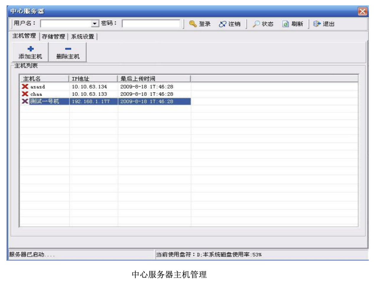 5.主機管理。對前端主機的維護,包括增加、刪除和修改主機信息。查看主機和相機的連接狀態。