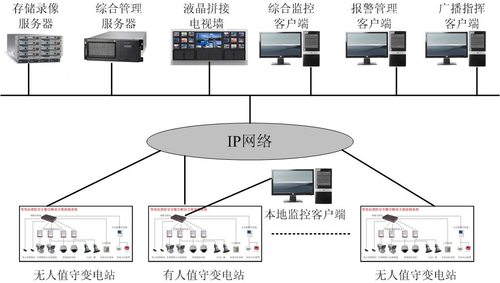 如圖所示,各變電站消防安全前端系統通過電力公司已有IP網絡傳輸到電力公司調度中心,在調度中心設置綜合管理服務器、存儲錄像服務器、液晶拼接電視墻和專業客戶端;對于前端有人值守的變電站,只需要設置一臺客戶端計算機即可,安裝相應軟件,分配管理權限,通過訪問調度中心的服務器獲取本站的所有監控管理信息。