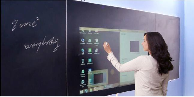 正面顯示為一個(gè)由三塊拼接而成的平面普通黑板,可以在上面用各種水筆書寫,又可以根據(jù)需要采用粉筆書寫。當(dāng)打開電源時(shí),中間一塊顯示出液晶的顯示畫面,可以進(jìn)行觸摸互動(dòng),而關(guān)掉時(shí),顯示畫面隱形,又顯示為一個(gè)普通黑板的表象,在上面進(jìn)行書寫。