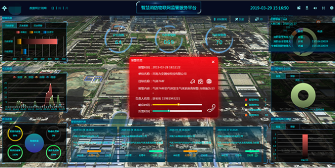 可視化區(qū)域大屏監(jiān)控管理城市所有入網(wǎng)單位安全情況,地圖熱點分布,警情趨勢分析,消防水源,微型消防站,資源管理等。