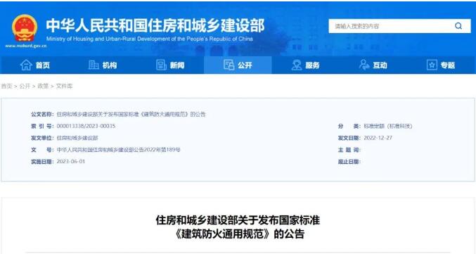 2023年1月,住建部發布國家標準《建筑防火通用規范》。自2023年6月1日起實施本規范為強制性工程建設規范,全部條文必須嚴格執行同時廢止了781項建設標準相關強制性條文
