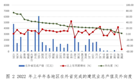 2022年上半年,各地區(qū)在外省完成的建筑業(yè)總產值排名前兩位的仍然是江蘇和北京,分別為6098.8億元和4736.2億元。兩省在外省完成產值之和占全部在外省完成產值的比重為 24.6%。