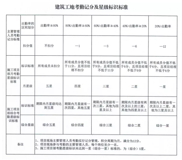(三)施工現(xiàn)場(chǎng)關(guān)鍵崗位人員考勤實(shí)行記分管理,積分周期為月,滿分為12分。次月依據(jù)考勤對(duì)象上月出勤率進(jìn)行記分。