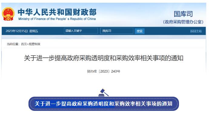 12月14日,財(cái)政部發(fā)布《關(guān)于進(jìn)一步提高政府采購?fù)该鞫群筒少徯氏嚓P(guān)事項(xiàng)的通知》(財(cái)辦庫〔2023〕243號(hào)),本通知自印發(fā)之日起施行。明確: